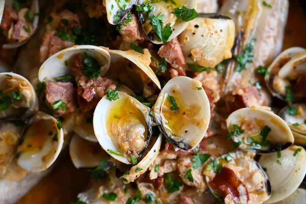 Spoon the clam sauce over the monkfish and scatter over the remaining Italian Flat-Leaf Parsley (1/2 handful). Serve immediately.