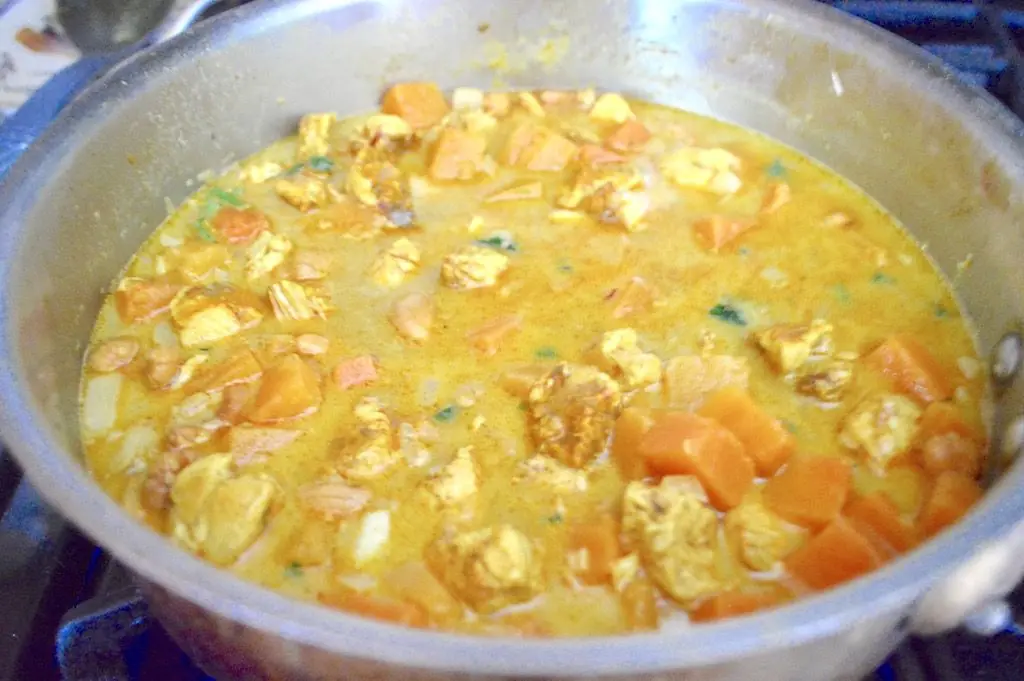 Add in the Butternut Squash (2 cups) and let it start to soften for a couple of minutes. Then stir in the Onion (1/2), Garlic (3 cloves), Fresh Cilantro (1 Tbsp), and Cashew Nuts (1/2 cup). Let them get fragrant for a few more minutes.