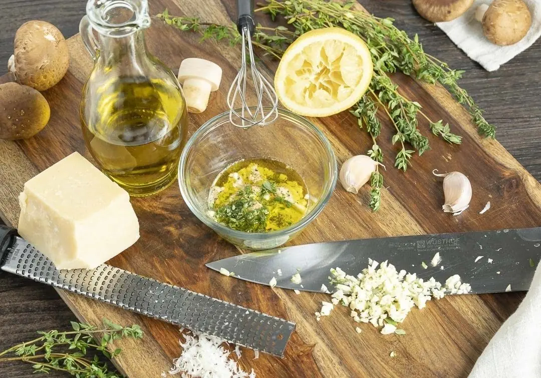 In a small bowl whisk together juice from Lemon (1), Olive Oil (1 Tbsp), Dijon Mustard (2 tsp), Fresh Thyme (1 tsp), Kosher Salt (1/4 tsp) and Ground Black Pepper (1/4 tsp). Set aside.