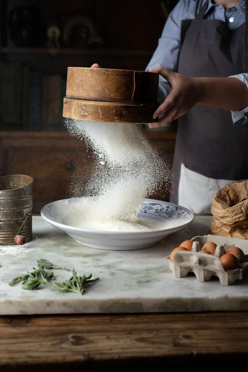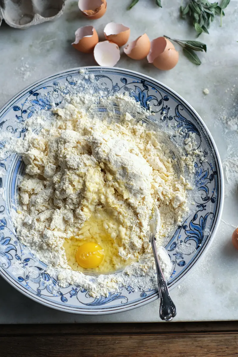For the ravioli dough, sift the Type 00 Flour (2 1/3 cups) and add a good pinch of Salt (1 pinch). On a flat surface, turn out the flour and make a well in the center.