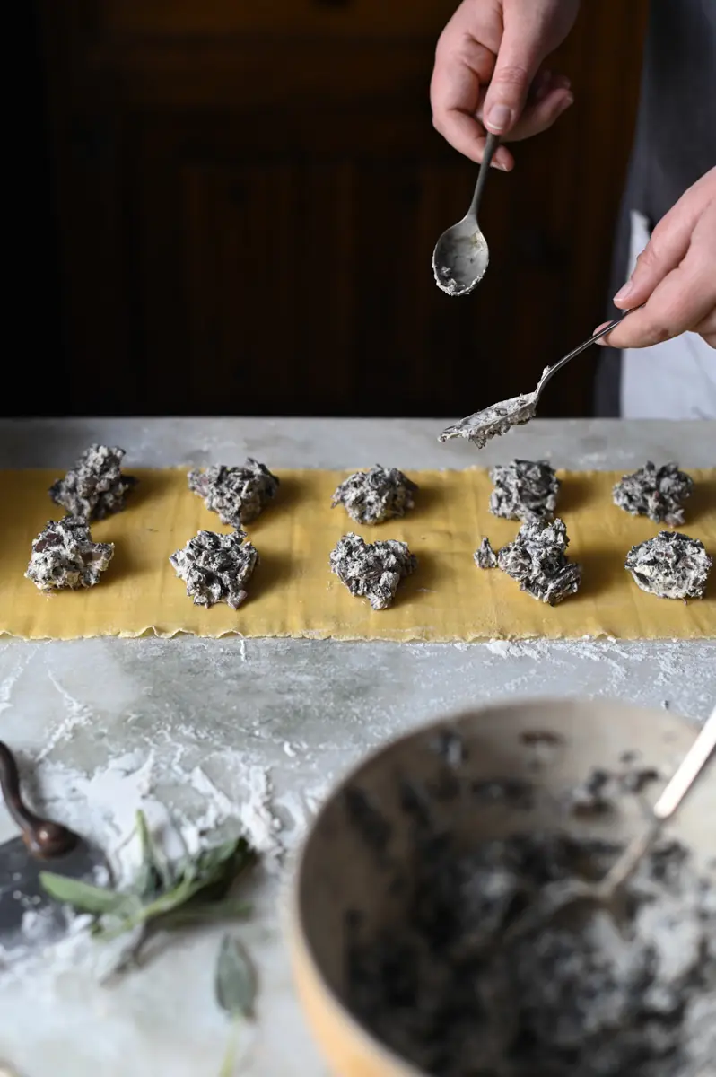 Spoon the chilled ricotta mixture along the pasta sheet, working in 10-milliliter dollops spaced equidistantly to allow for an edge.