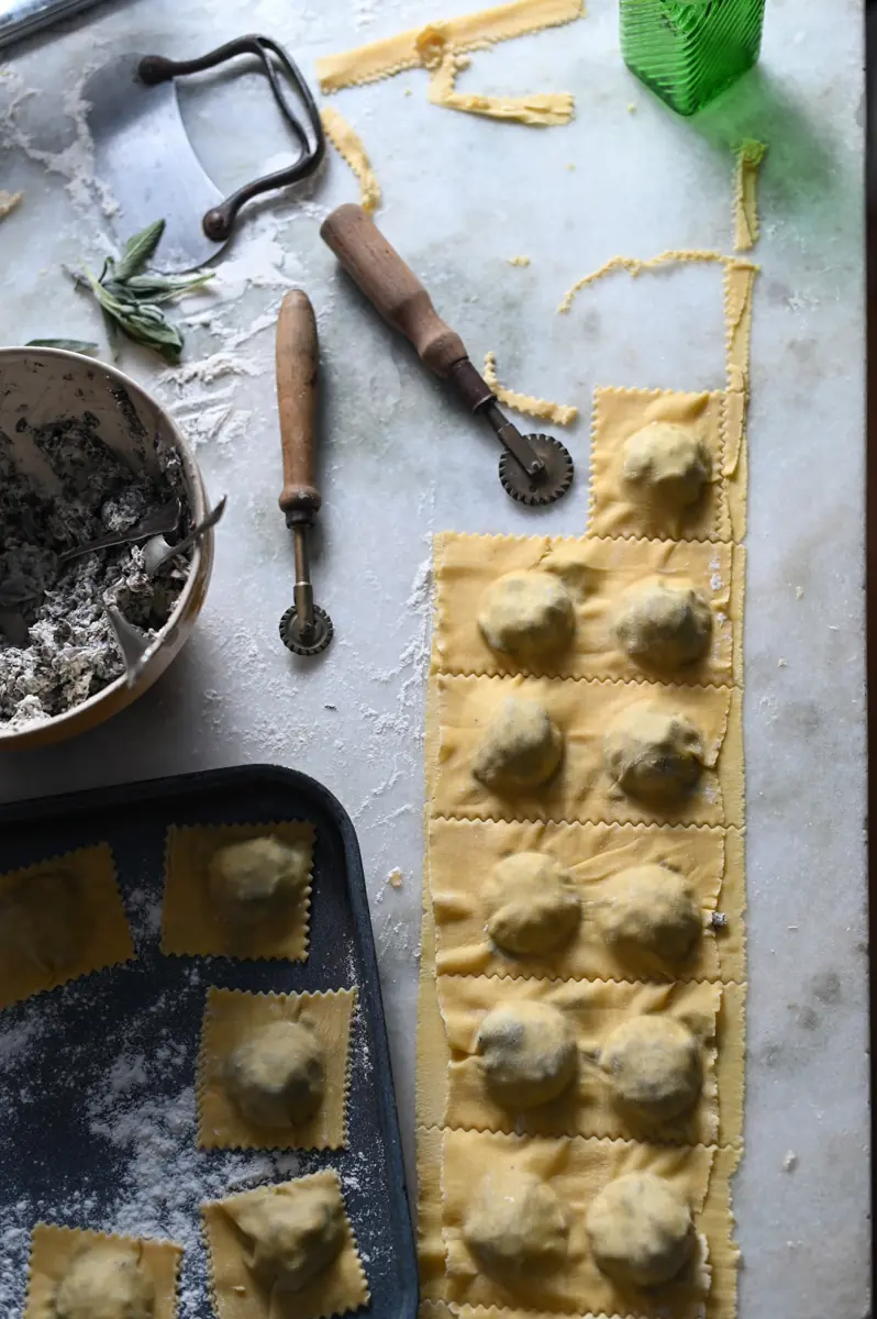 Seal the edges of the ravioli pockets with a brush of water and if desired, use a ravioli cutter to press out small pockets. Set the cut ravioli on a lined baking sheet sprinkled with semolina until ready to cook.