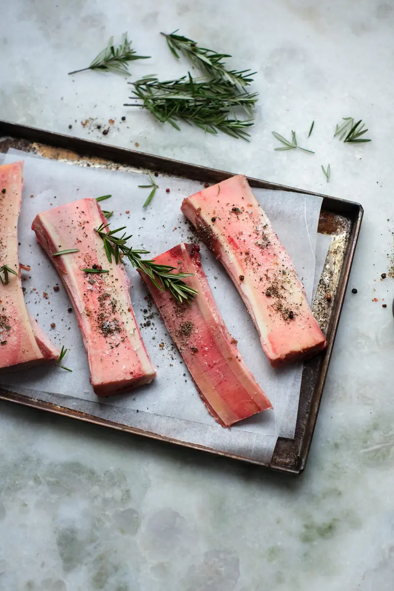Arrange the Beef Marrow Bones (8) on a lined baking sheet and season with Coarse Sea Salt (to taste), Ground Black Pepper (as needed), and Fresh Thyme (4 sprigs).
