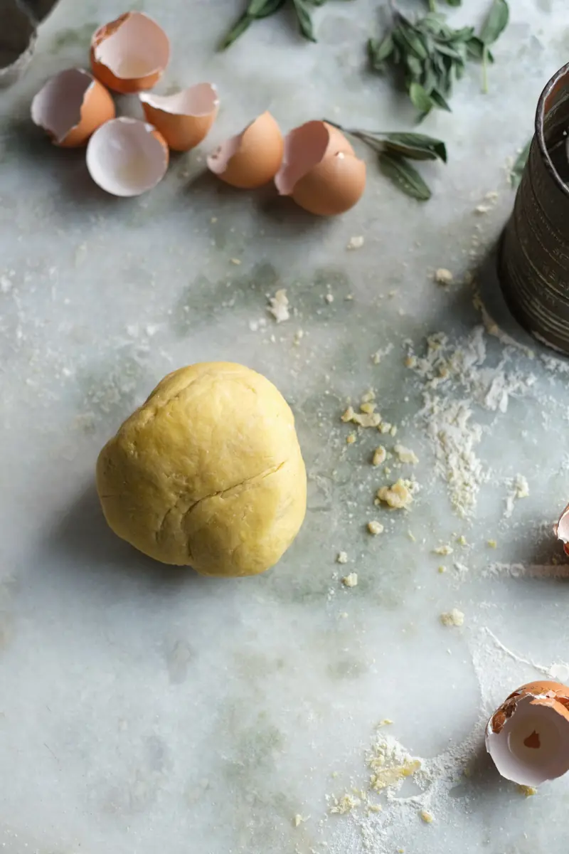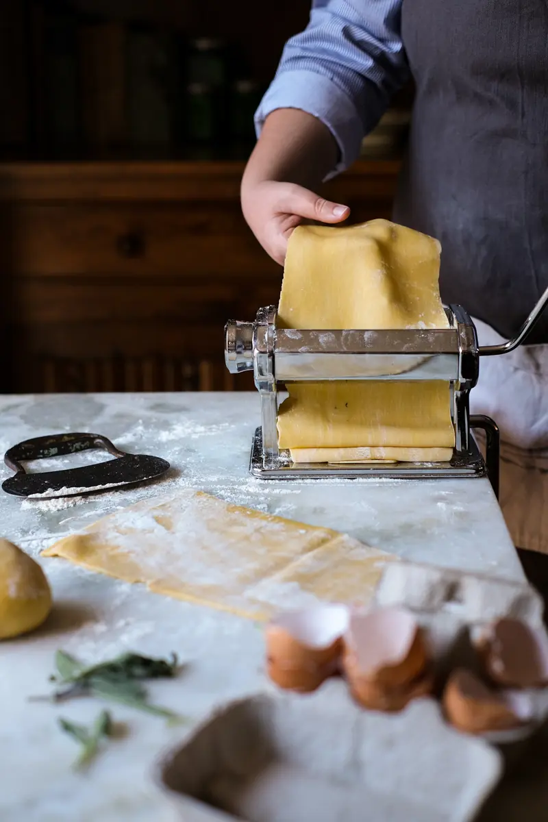 Halve the dough and keep one half wrapped in clingfilm to prevent it from drying out. Using a pasta machine or a rolling pin, roll out half the dough until you have a thin strip about 8 centimeters wide.
