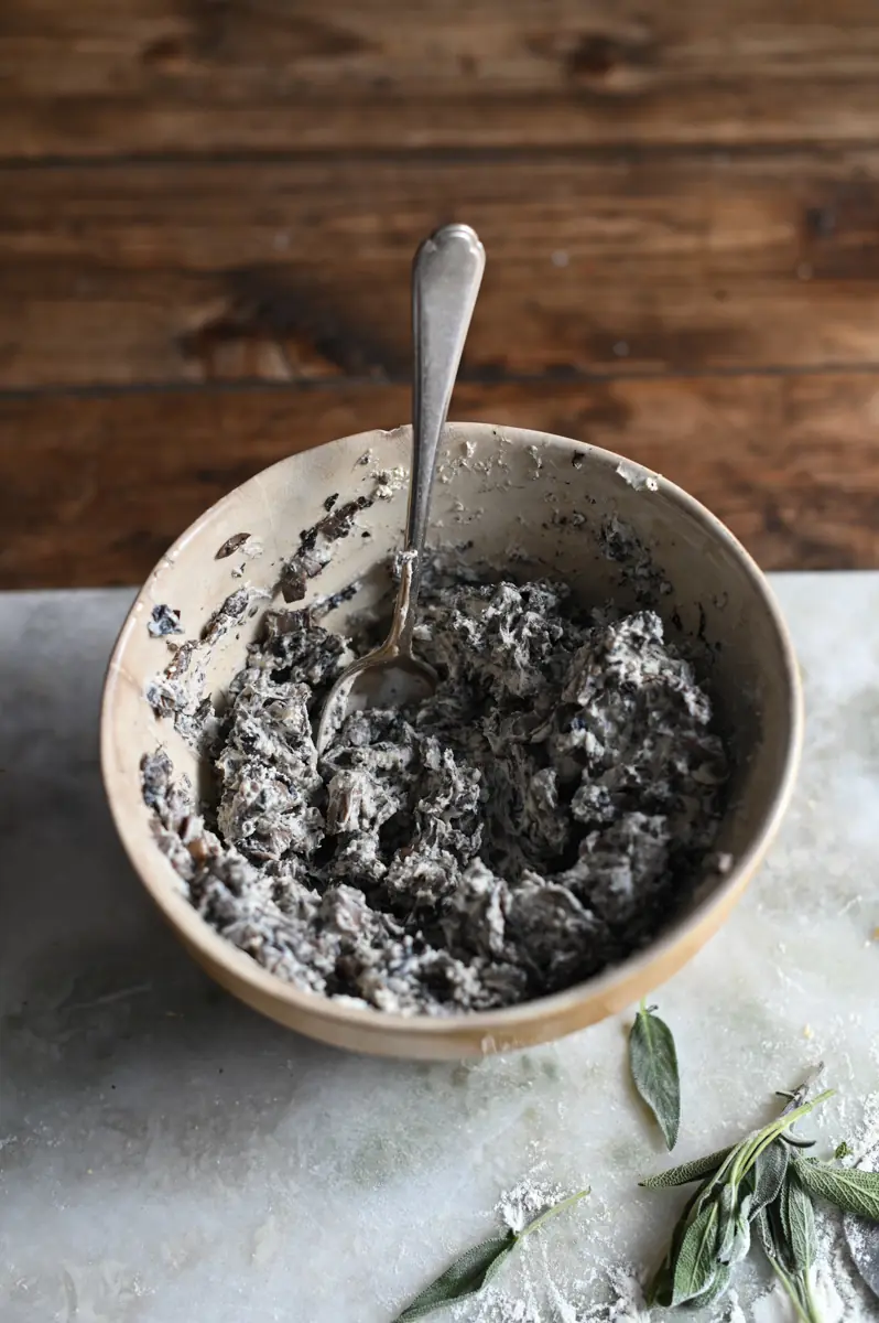 To make the filling, combine the Ricotta Cheese (1 cup) with the cooked mushrooms in a bowl. Season to taste and cover with clingfilm. Refrigerate until needed.