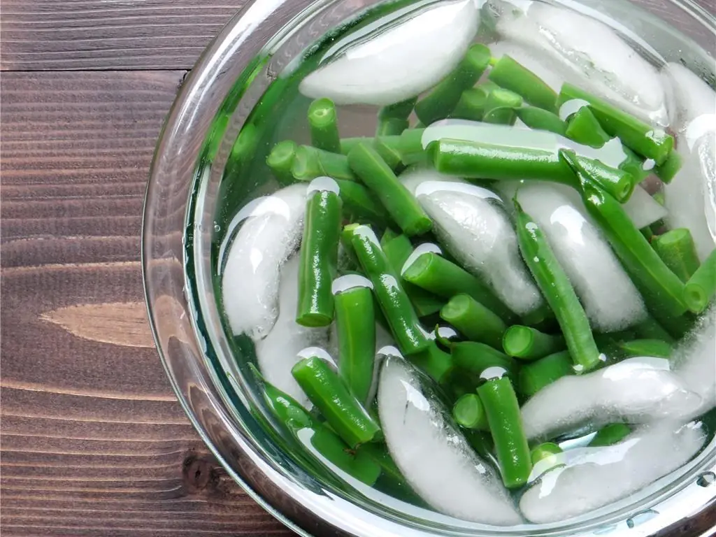 Fill a medium saucepan halfway with water. Add a teaspoon of Kosher Salt (1 tsp) and fit the pan with a lid. Bring to a boil over high heat. Remove the lid and add the Green Beans (2 cups). Cook the beans for 4-5 minutes until crisp tender. Use a spider or slotted spoon to scoop the beans from the water and plunge them into the ice bath to stop the cooking. Set aside.