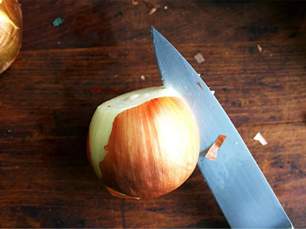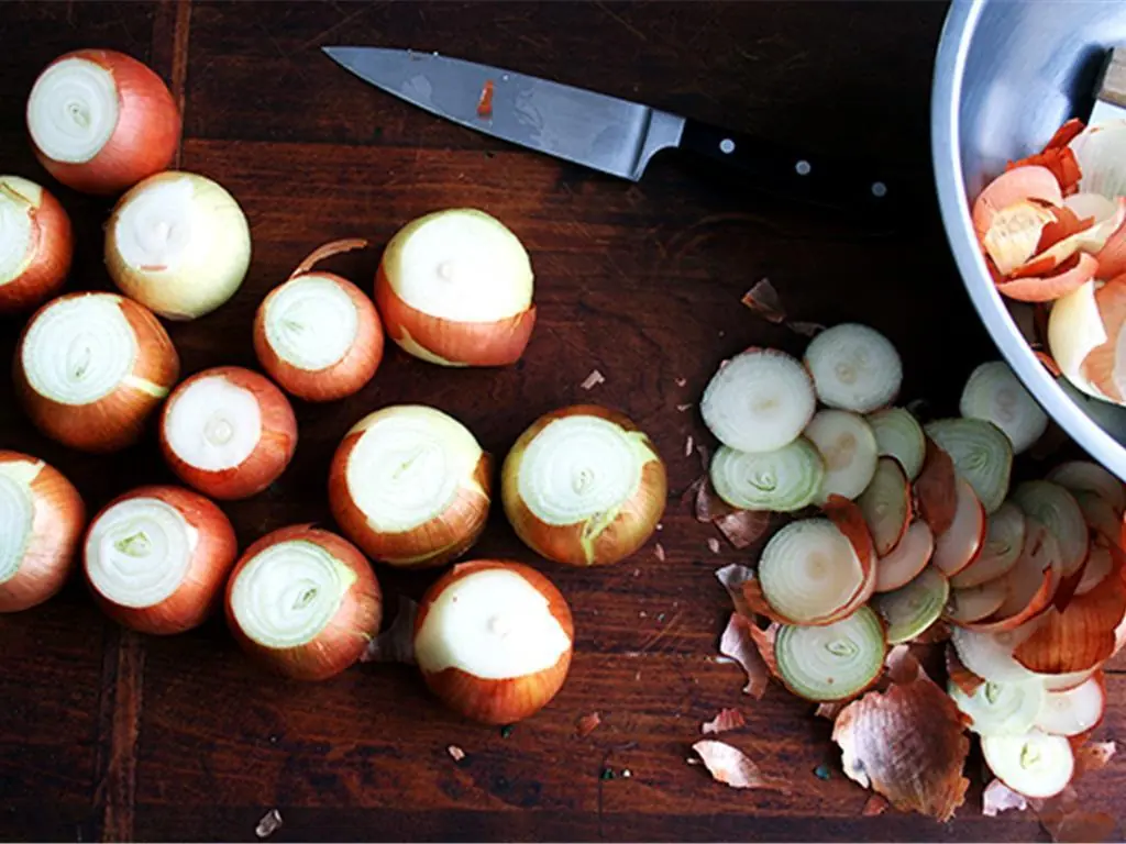 Prepare two large bowls — one for the scraps and one for the Onions (18 cups). A bench scraper is nice to have close by, too. Start by trimming off the ends of each onion, collecting scraps in one of the bowls as you go.