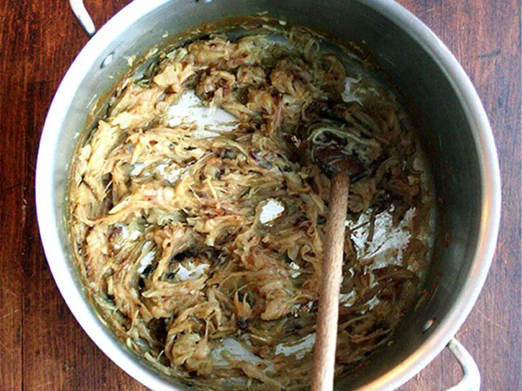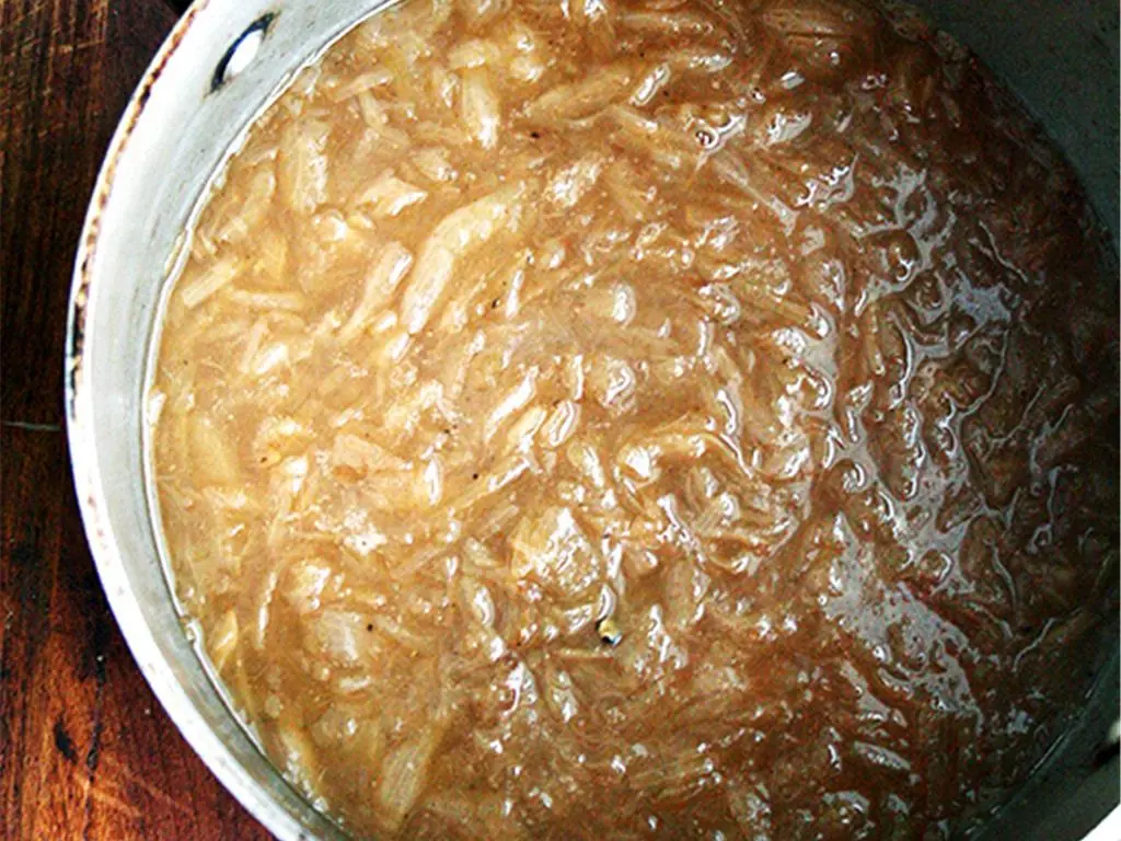 When the onions have completely cooked down, the water has cooked off, and the onions have turned amber, add Water (6 cups). Raise the heat to high and bring the soup to a simmer, then reduce the heat to low.