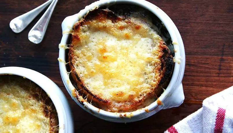 Good French onion soup should be made with little more than water, onions, bread, and cheese. Using chicken or beef stock in such a peasant dish not only betrays the soup’s economical roots but also muddles the soup’s pure onion flavor.