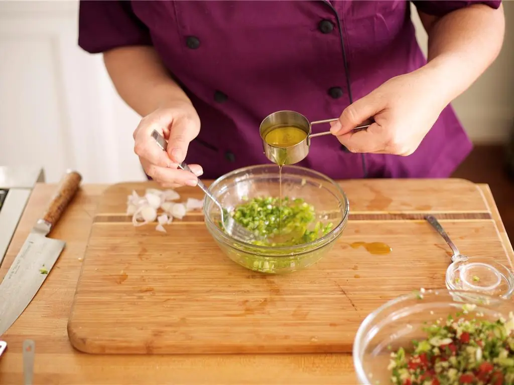 Slowly drizzle in Olive Oil (4 Tbsp) and use a fork to blend. Cut the remaining lime into 4 wedges, and set aside for garnish.