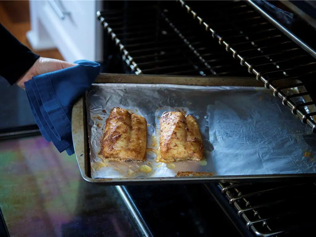 Pat dry Cod Loins (2) with paper towels. Rub the mixture onto both sides of the fish, making sure the top sides are well coated. Place onto a rimmed baking sheet lined with foil and roast for seven minutes or until fish flakes easily with a fork. Remove from oven.