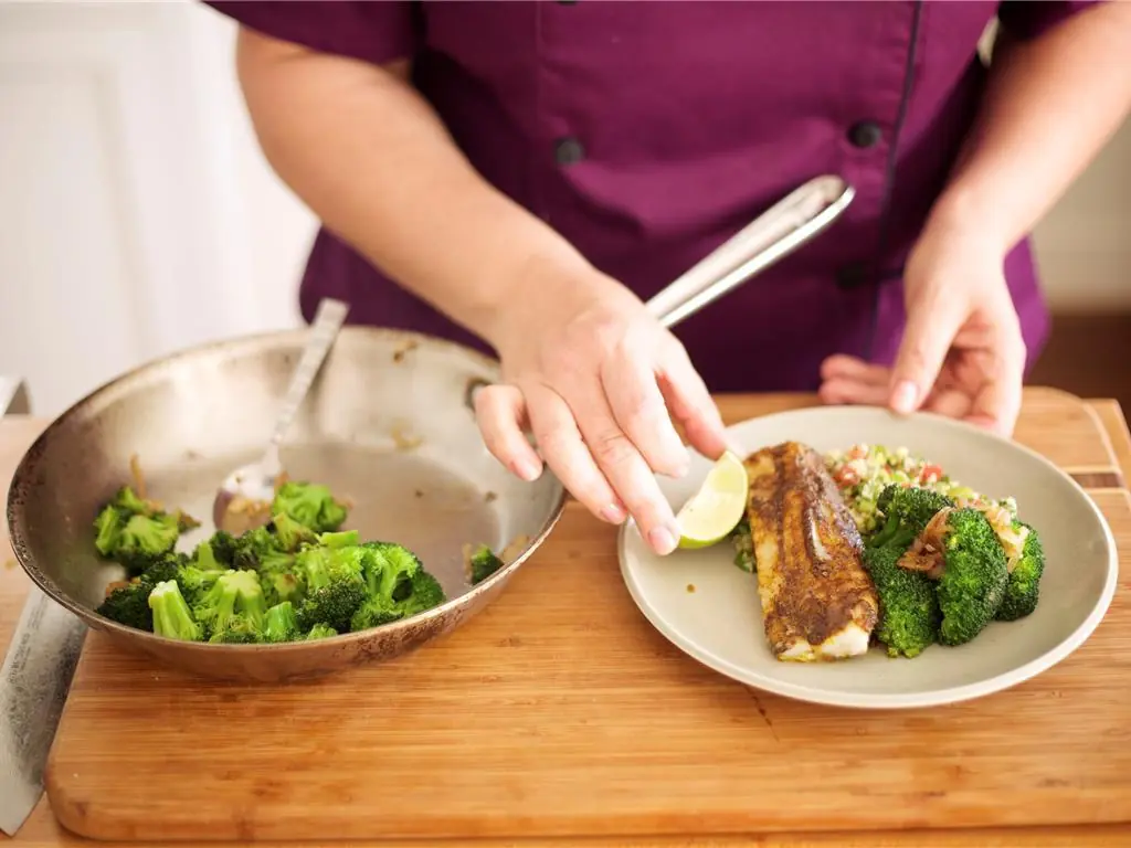 Plate broccoli florets and shallot against the other side of the couscous with the shallots displayed on top. Garnish with Lime (1) wedges.