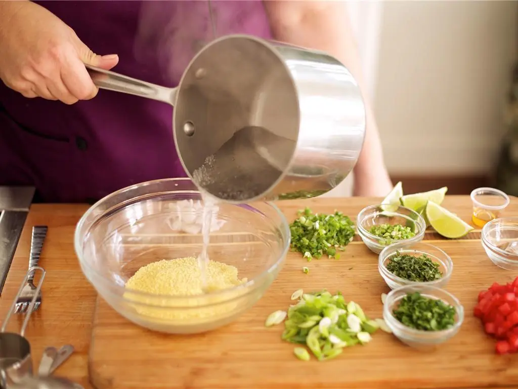 Place the Couscous (1/3 cup) in a medium heatproof bowl. Add just enough boiling water to cover couscous.