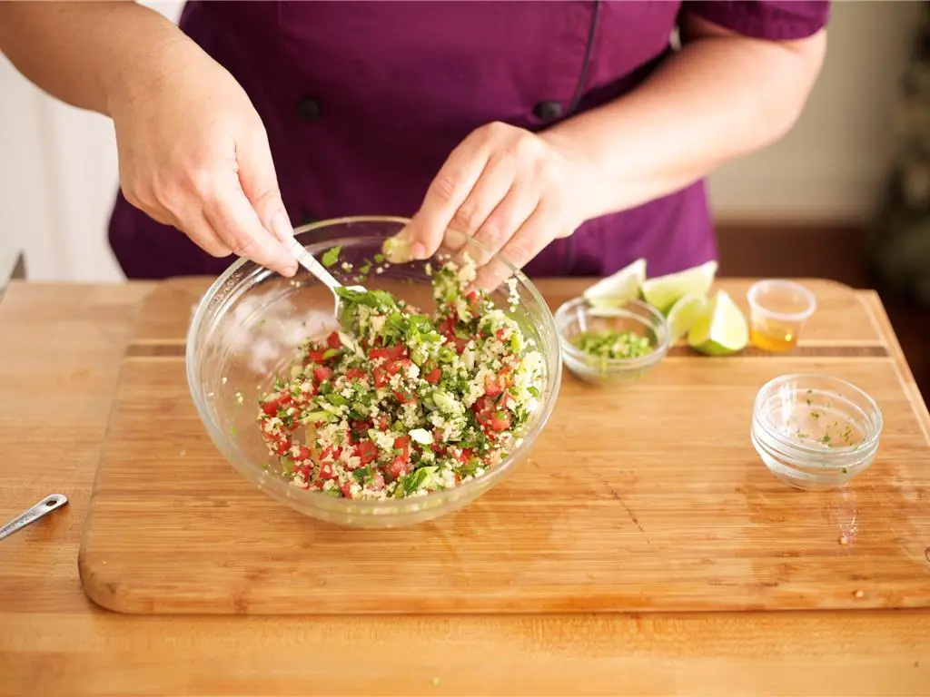 Finely chop Fresh Parsley (1/3 cup) and Fresh Mint (1/2 cup) leaves and add to tomatoes.