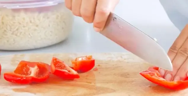 Chop and deseed the Roma Tomatoes (2), Cucumber (1), and Red Chili Pepper (1).