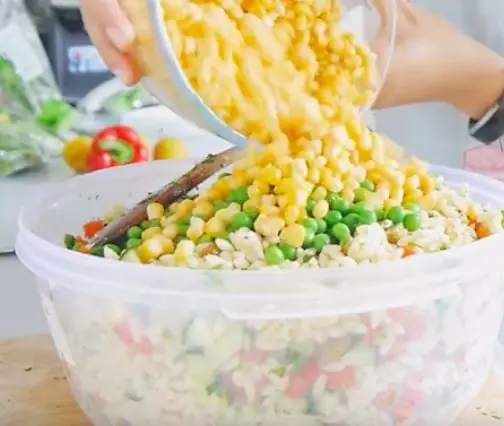 In a large bowl, combine the chopped tomatoes, cucumber, red pepper, Cherry Tomato (1 cup), Green Olives (1 cup), Fresh Basil (1 cup), Fresh Chives (1 cup), Fresh Dill (1 cup), Fresh Parsley (1 cup), Fresh Cilantro (1 cup), pasta, Green Peas (1 cup), Sweet Corn (2 cups), and Salt (to taste) and Ground Black Pepper (to taste).