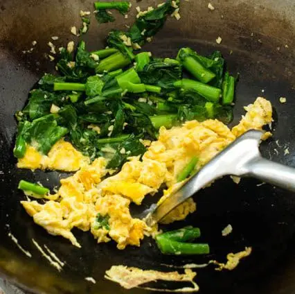 Return the chicken, Chinese broccoli and egg to the wok. Toss to combine all ingredients, then transfer to a serving plate.