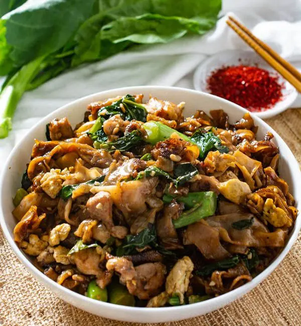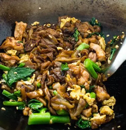Pad See Ew is a popular Thai street-food dish that features flat rice noodles stir-fried in a delicious soy sauce mixture. Dark soy sauce is the star ingredient in this dish, giving the rice noodles a nice balance of sweet and savory.