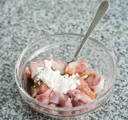 Marinate the chicken in Soy Sauce (1 Tbsp) and Corn Starch (1 tsp) for 15 minutes.