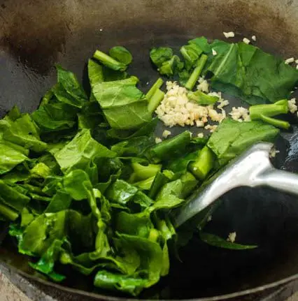 Add Cooking Oil (1 Tbsp) to the wok, followed by the Garlic (3 cloves), and Chinese broccoli. Stir-fry until the stems of the Chinese Broccoli are slightly soft, 1 - 2 minutes.