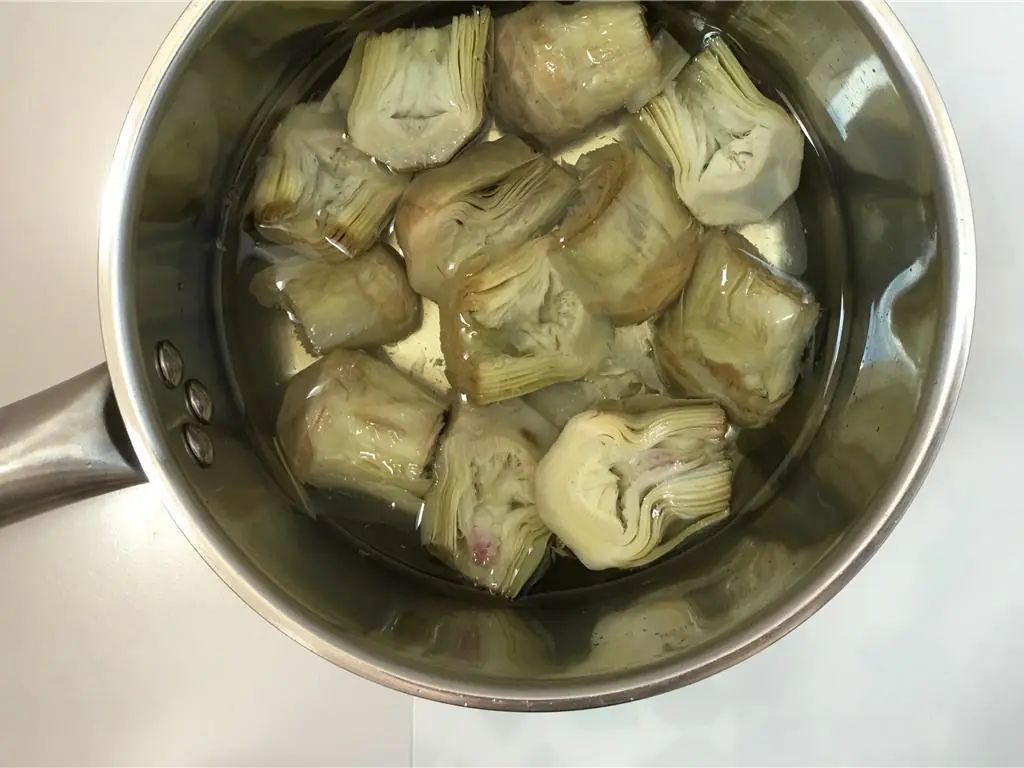 If you are using fresh Baby Artichokes (6) clean and trim them first. Then add the cleaned fresh artichokes or the frozen artichokes to a large saucepan and add water until the artichokes are fully submerged. Season with a pinch of Salt (to taste).