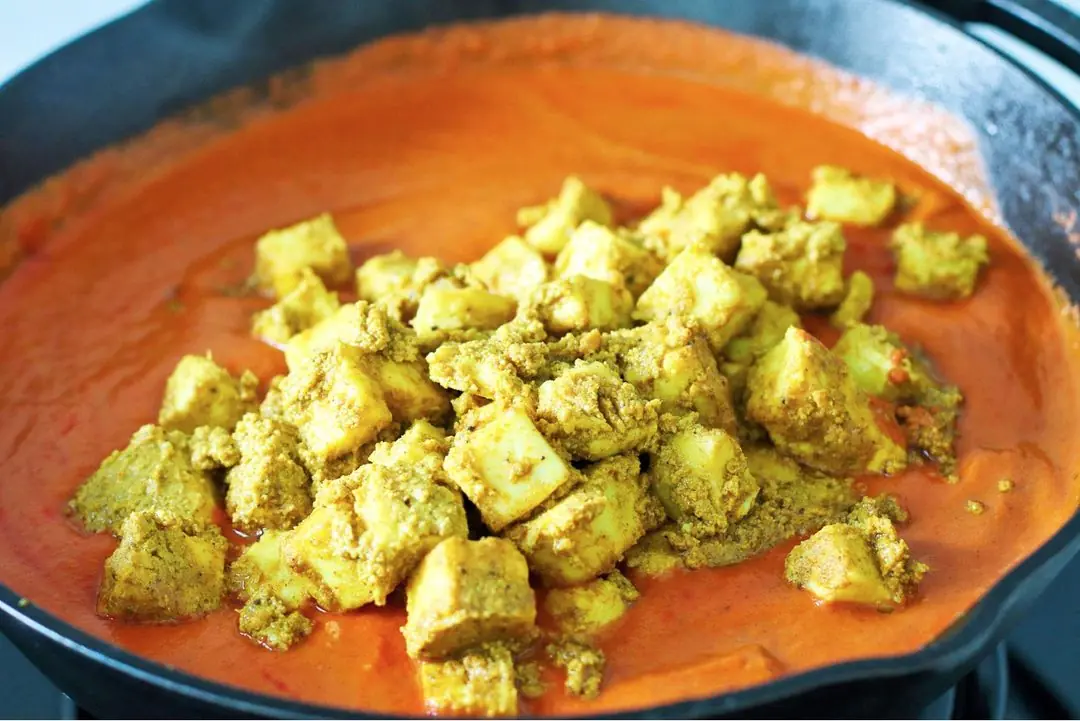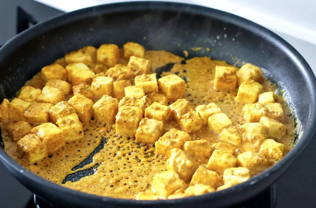 Mix with a spoon until fully combined, then add the Paneer (1 3/4 cups). Carefully mix to fully coat the paneer in the marinade. Cover with cling wrap or a plate, and allow for the paneer to marinate for 1 hour, or overnight in the refrigerator for best results.