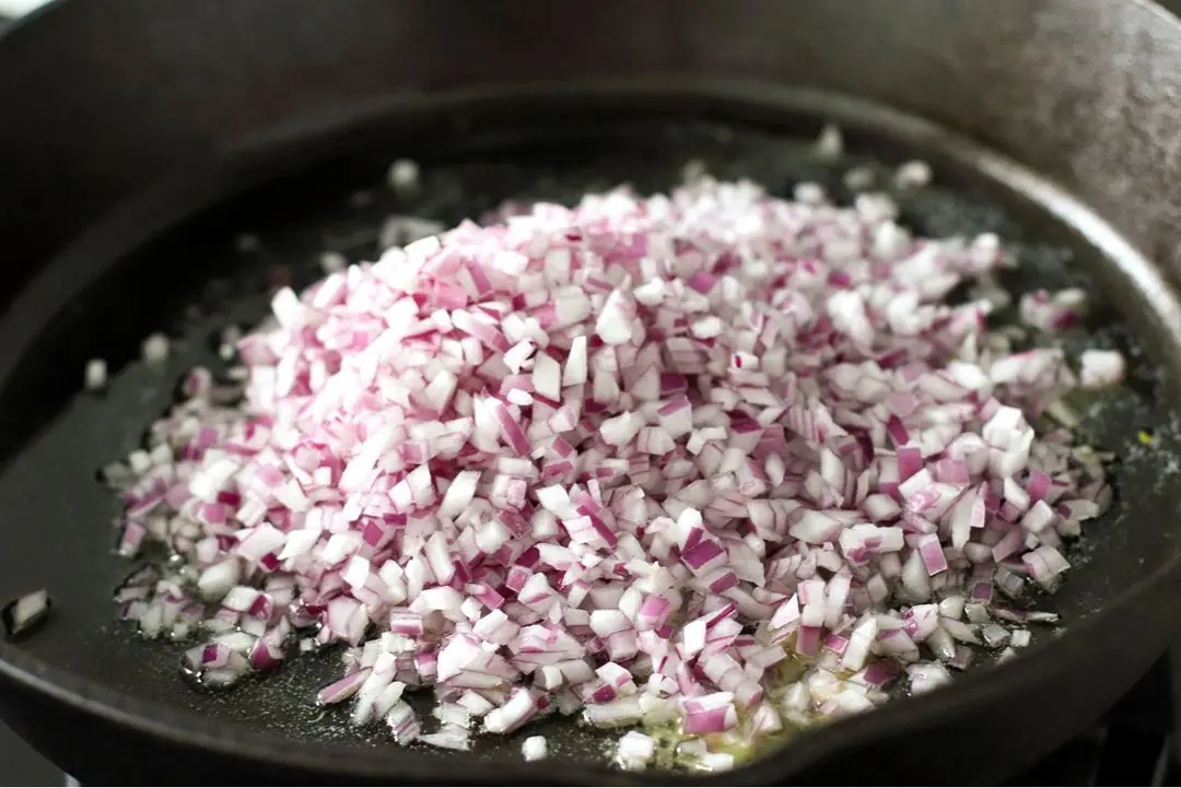 Heat the Unsalted Butter (2 Tbsp) and Olive Oil (1 tsp) in a deep skillet or sauté pan over medium-high heat. Once hot, add the Red Onion (1) and sauté until softened, about 1-2 minutes.