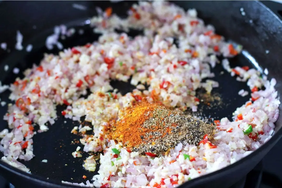 Add the Red Chili Peppers (5) and Green Chili Pepper (1) and sauté for another minute, then stir in the contents of the spice bowl and stir to combine everything in the pan.