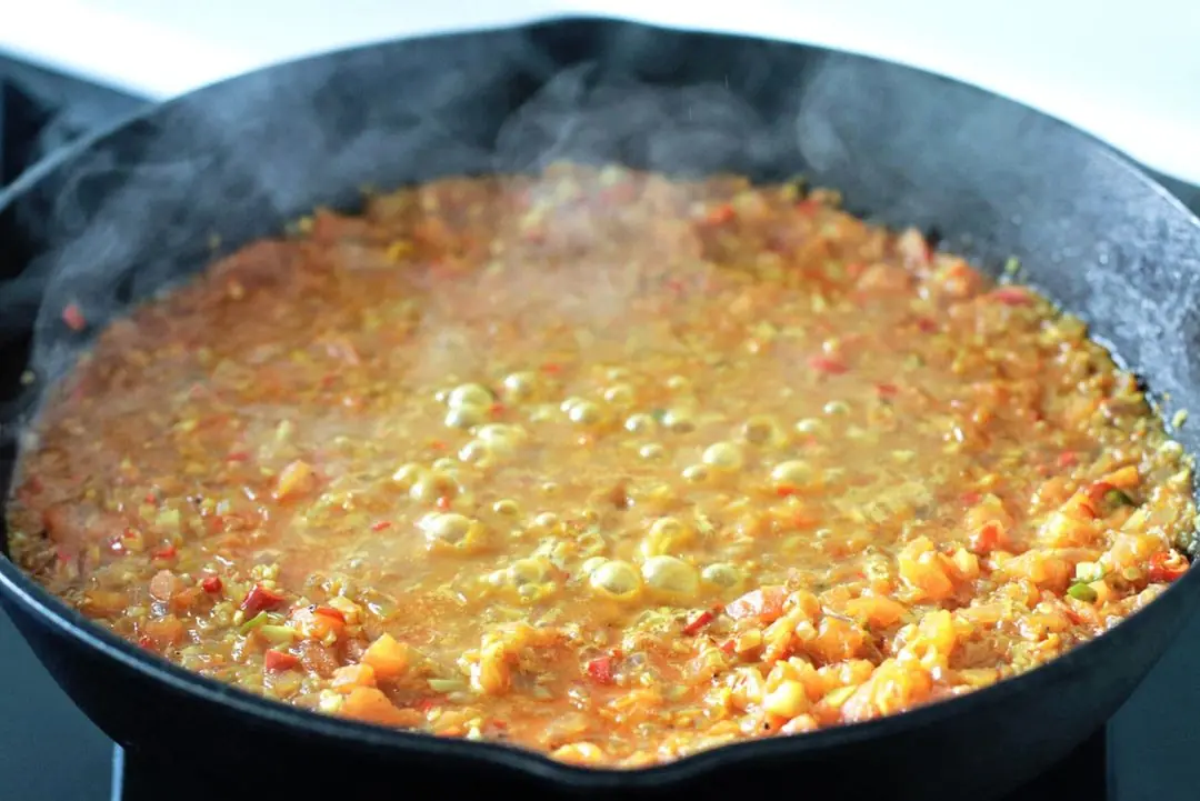 Add the Tomatoes (2) and pour in the Water (1 cup). Stir, and then turn down the heat to low and cover the pan. Simmer for 5-6 minutes.
