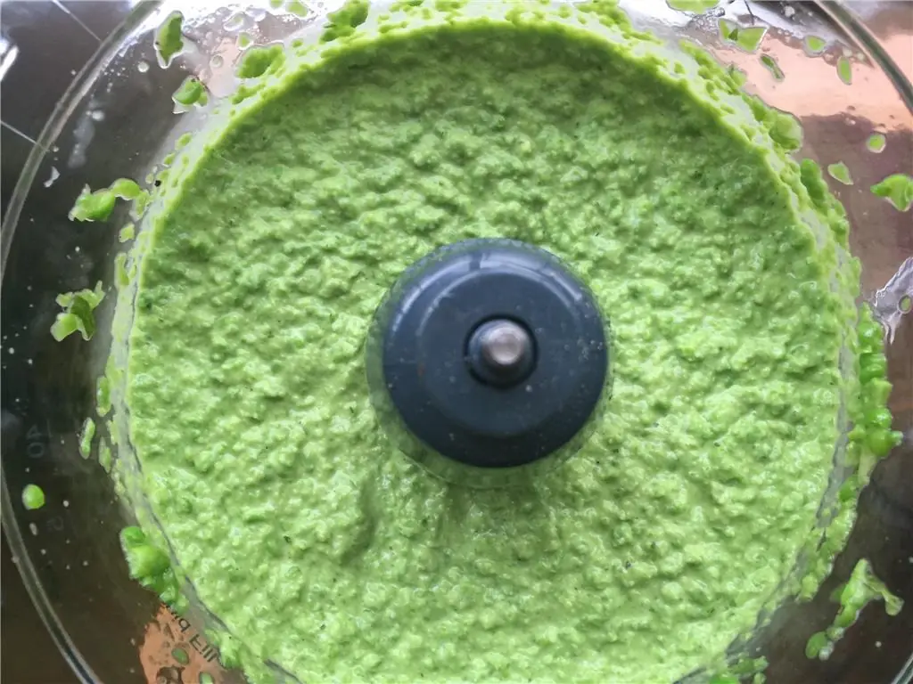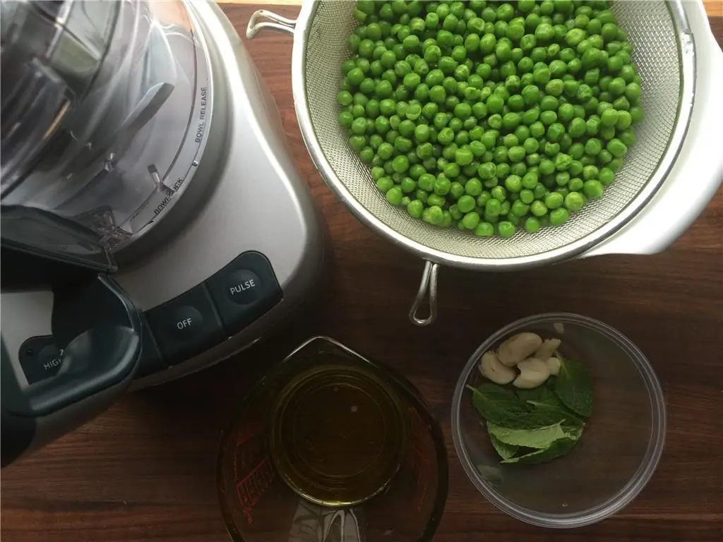 Place Frozen Green Peas (4 cups), Fresh Mint Leaves (10), Garlic (2 cloves), Salt (1/2 tsp), Ground Black Pepper (1/8 tsp), and Extra-Virgin Olive Oil (1/3 cup) in a food processor.