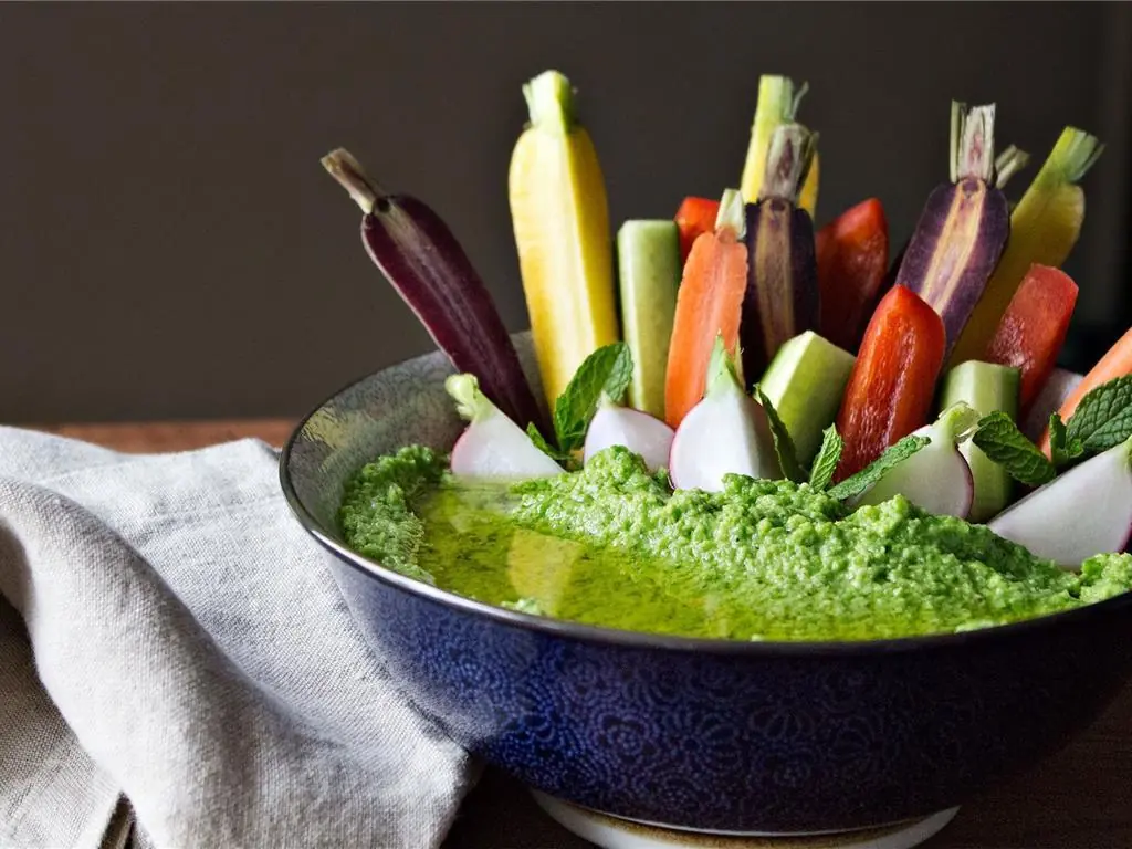 Chef Gale Gand's pea and garlic hummus is a perfect spring and summer dipping dish. It smacks of the first produce of the season and is such a lively green color! Serve with your choice of seasonal crudités (our favorite), or atop crostini, beef tenderloin or shrimp.
