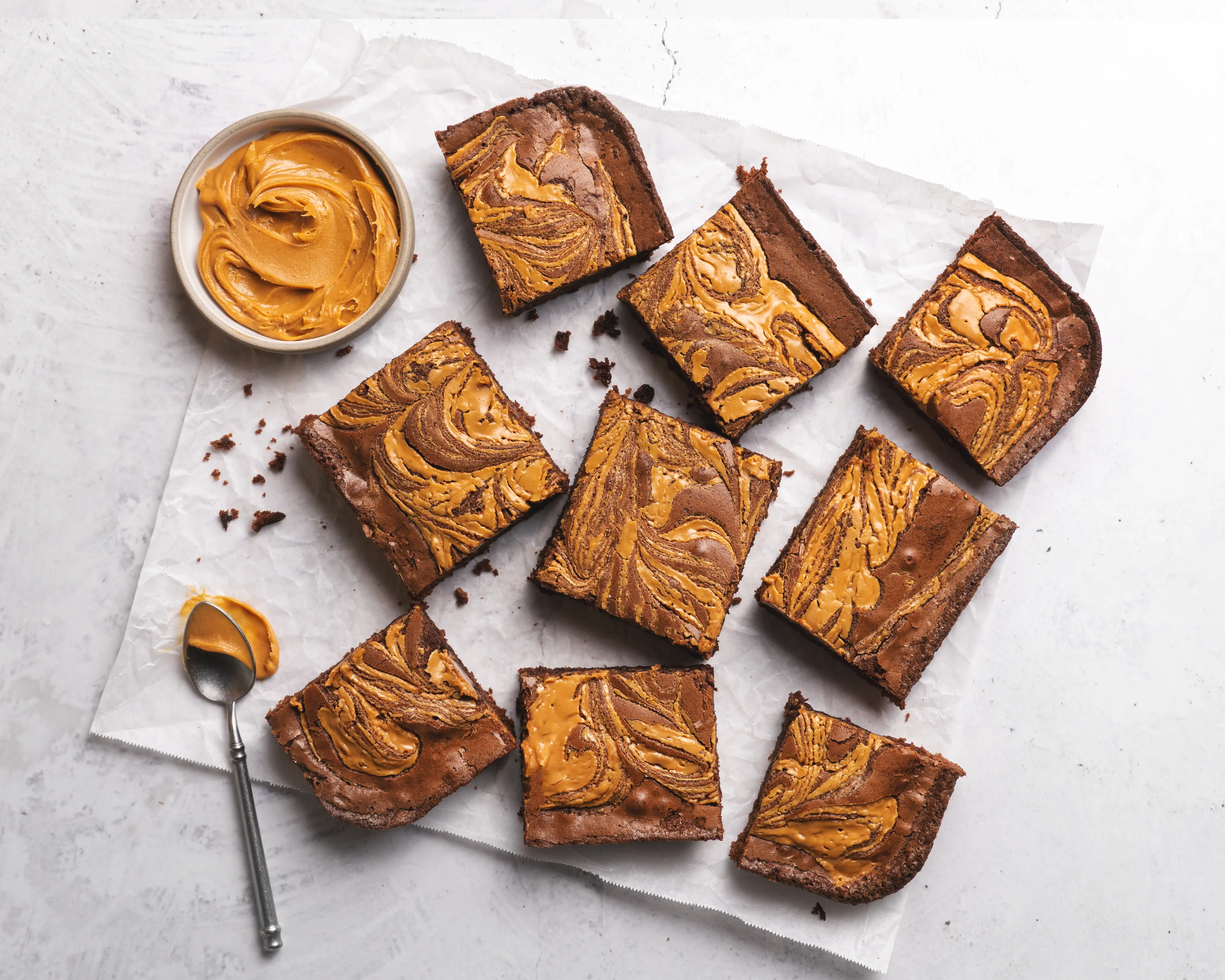 Dollop 15-20 spoonfuls of peanut butter in 5 x 4 rows over the brownie batter. For a marbled design, pull a knife through the batter and fill about 1 inch apart; turn the baking dish and repeat.