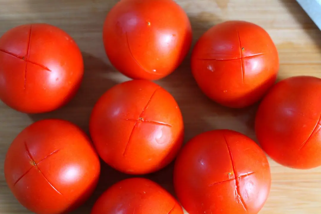 Wash the Tomatoes (8) and use a knife to cut an "X" on the bottom of each.