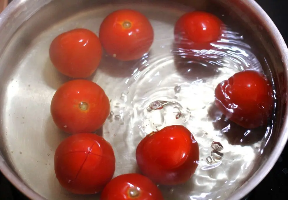Blanch the tomatoes in boiling water with a generous pinch of Kosher Salt (to taste) water for 30 seconds.