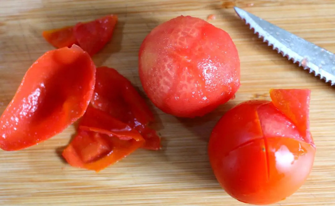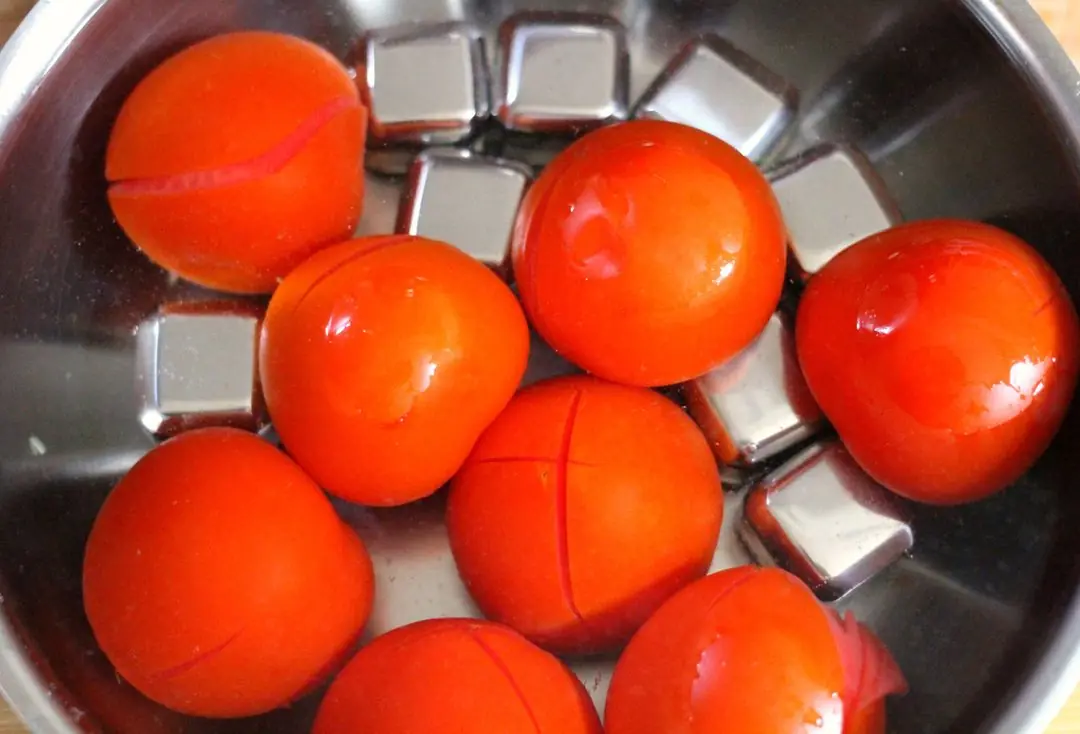 Remove the tomatoes and place an Ice (to taste) bath to stop the cooking.