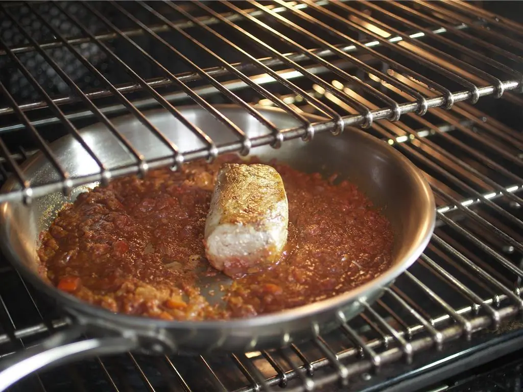 Return pork to the pan with the crushed tomato mixture and braise in the oven for thirteen minutes or until desired doneness, and set aside. Remove pork from pan and slice into half inch slices, then keep warm.