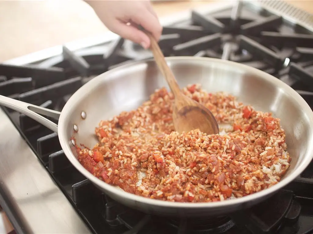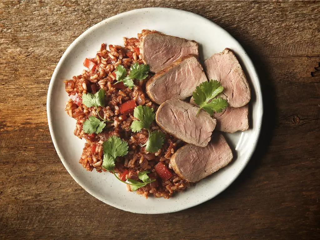 In the center of two plates, scoop a portion of the colorful rice. Top with the pork tenderloin slices. Garnish with cilantro leaves.