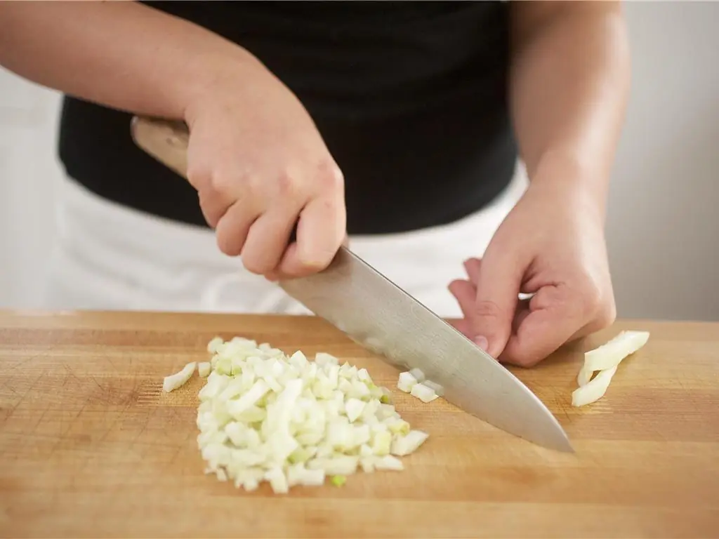 Peel the Onion (1/2). Cut the onion and Red Bell Pepper (1/2) into quarter inch diced pieces. Add to the bowl with the garlic.