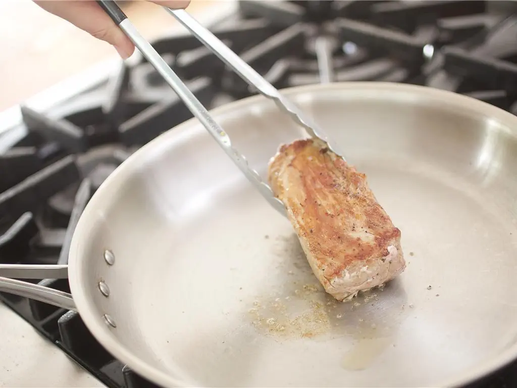 Pat the Pork Tenderloin (8 oz) dry with paper towels. Season with Salt (1/4 tsp) and Ground Black Pepper (1/4 tsp). In a large saute pan over medium high heat, add Olive Oil (1 Tbsp) and sear pork on all sides until deeply caramelized, two minutes on each side.