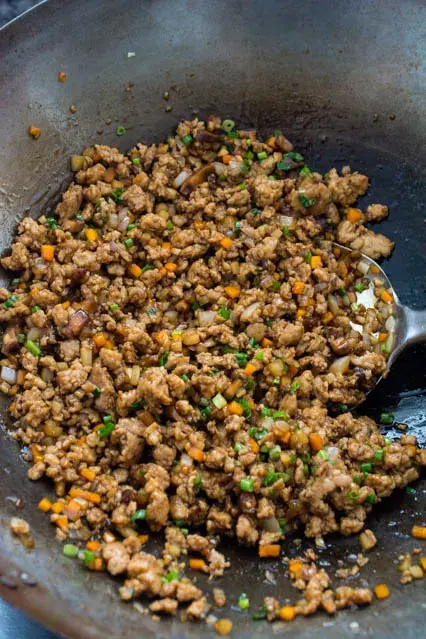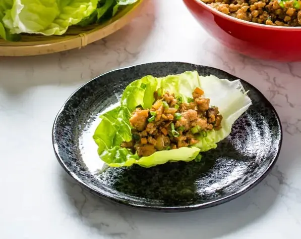 Pork Yuk Sung (Chinese Lettuce Wraps) is a Chinese appetizer or side dish that features ground pork and diced vegetables stir-fried in a sweet soy sauce mixture, then wrapped in crisp lettuce leaves.