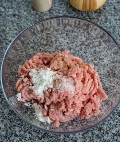 While waiting for the mushrooms to soak, add to a bowl Corn Starch (1 1/2 Tbsp), Salt (1 tsp), and Ground White Pepper (1 dash) to the Ground Pork (1 lb). Mix well, then allow to marinate for 20 minutes.