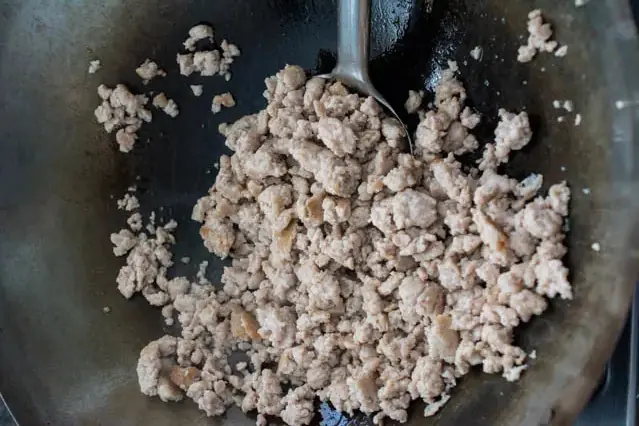 Heat Cooking Oil (2 Tbsp) in a wok over medium-high heat. Stir-fry the ground pork until mostly cooked, then remove the meat from the wok, and set aside.