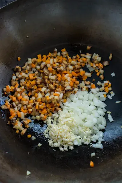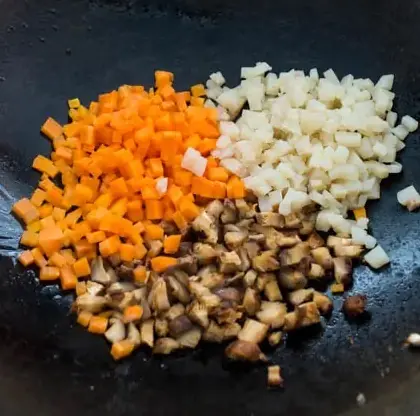 Add into the same pan the shiitake mushrooms, Carrot (1), and Water Chestnuts (1/3 cup) and stir-fry for 1–2 minutes.