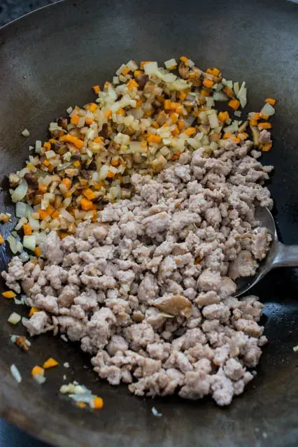 Return the ground pork to the wok, then stir-fry to combine all the ingredients.