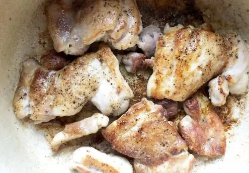 Melt Butter (1 Tbsp) in a Dutch oven or heavy pot over medium-high heat. Sprinkle Boneless, Skinless Chicken Thigh (1 lb) evenly with Kosher Salt (1/2 tsp) and Freshly Ground Black Pepper (1/4 tsp). Add chicken thighs to the pan; sauté for 3 minutes on each side or until browned. Remove chicken thighs.