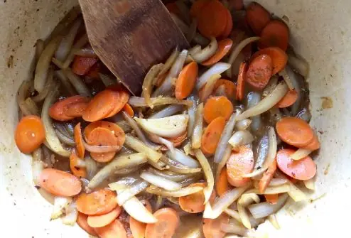 Add the Onions (2 cups), Carrot (1 cup), and White Miso Paste (1 Tbsp) to the pot; sauté for about 2 minutes, stirring occasionally. Add the Dry White Wine (1/2 cup); cook for 1 minute, scraping the bottom of the pot to loosen any browned bits.