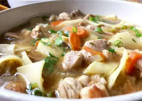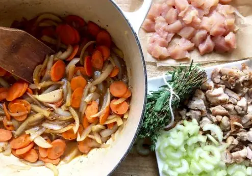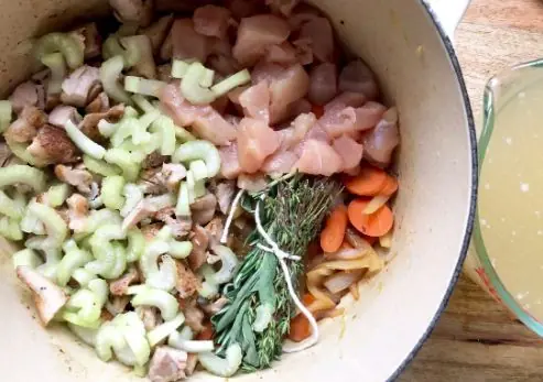 Chop the chicken thighs into bite-sized pieces then to the pot. Tie twine around Fresh Poultry Herb Blend (1 oz) to secure, forming an herb bouquet.