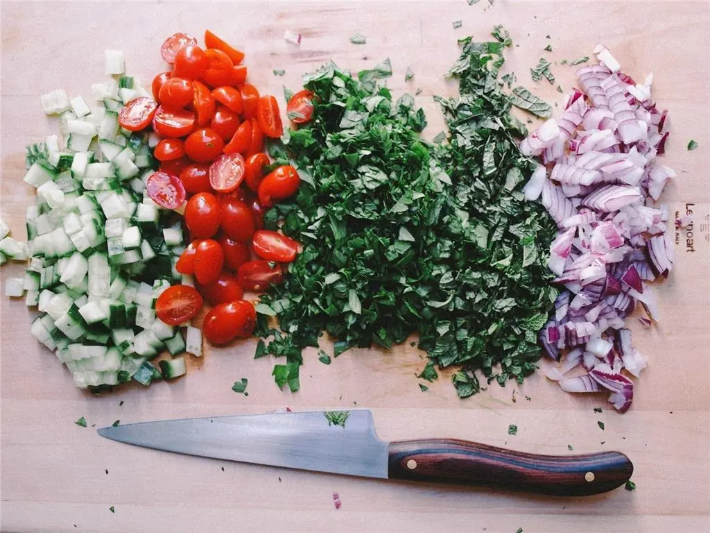 In the meantime, finely chop your Fresh Parsley (2 cups) and Fresh Mint Leaves (1 cup). Dice your English Cucumber (1), Red Onion (1) and halve the Grape Tomatoes (1 1/2 cups).