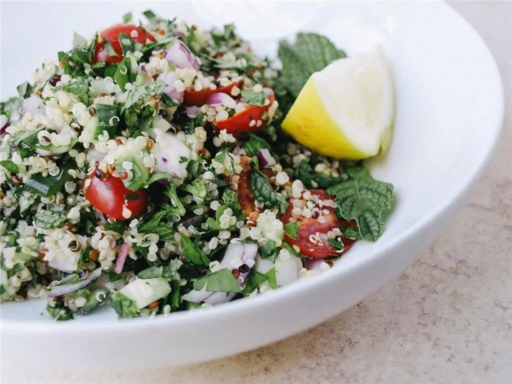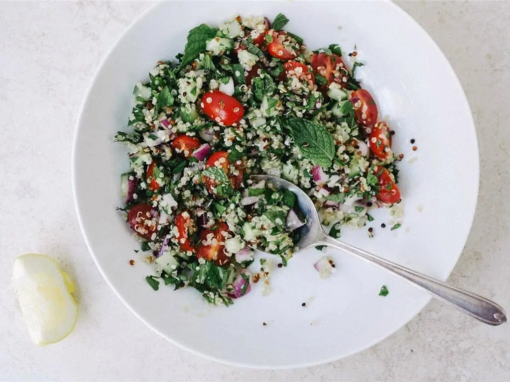 Tabbouleh is a popular traditional Middle Eastern dish. The ingredients remain the same but vary in ratio depending on the region. It traditionally uses bulgur wheat as the grain of choice but here we are using gluten free quinoa.