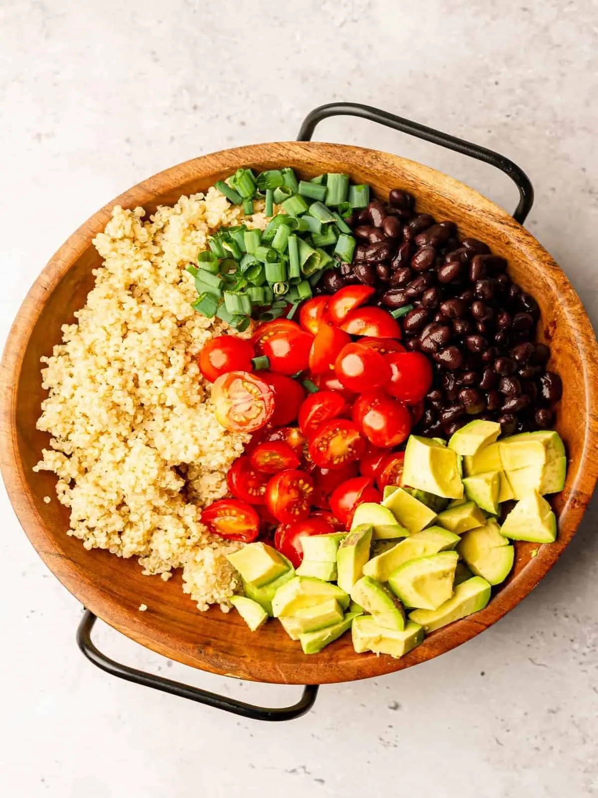 In a large bowl, add the Quinoa (3 cups), Black Beans (1 can), Cherry Tomatoes (2 cups), Avocado (1), and Scallions (4 Tbsp).